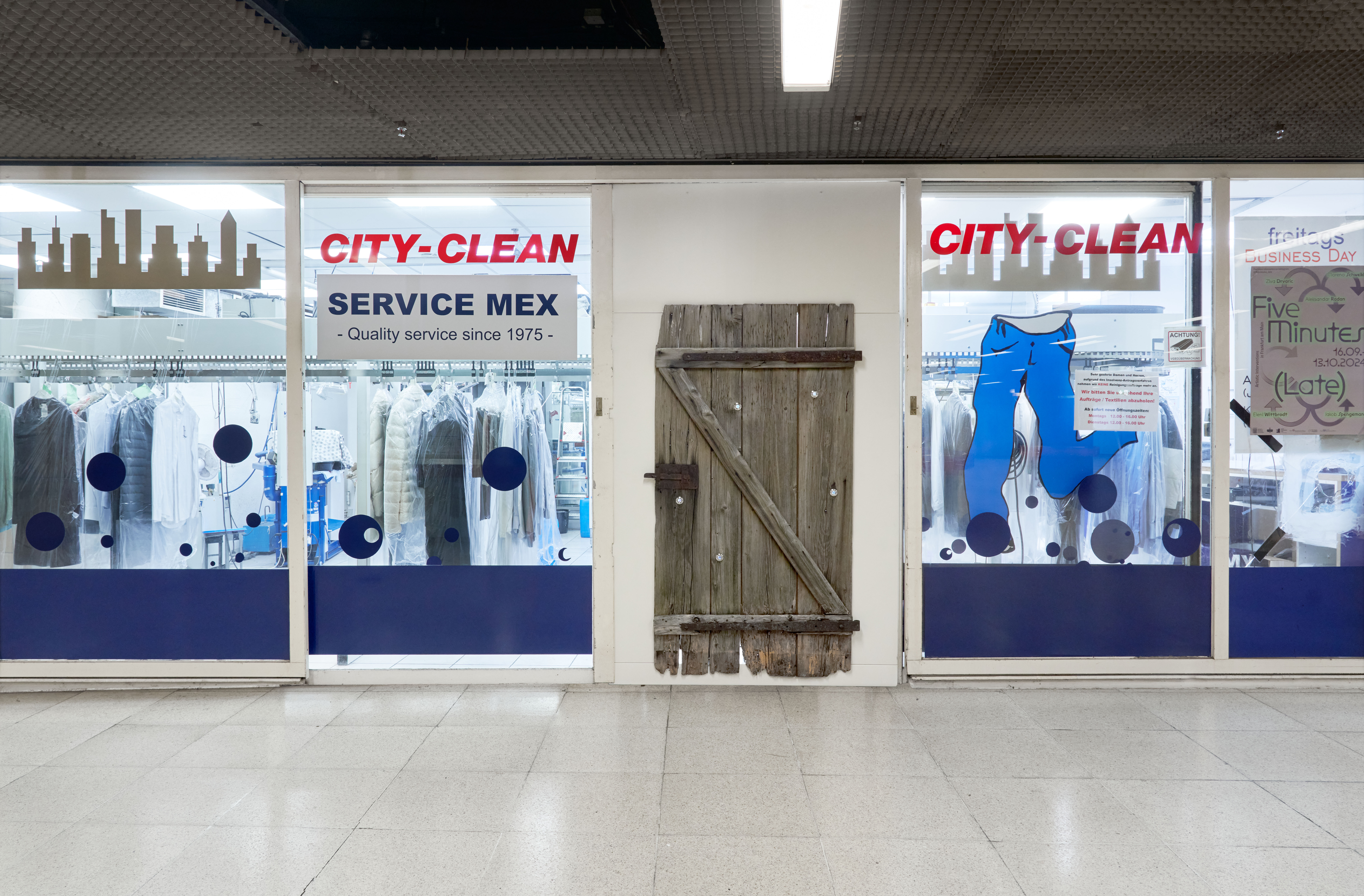 Vor diesem Hintergrund zeigt Moreno Schweikle mit Fitting B-Ebene (2024) eine situationsspezifische Intervention, welche die Überlagerung der durch Baustile reflektierten, urbanen und ländlichen Lebensweisen ins Zentrum rückt. Eine Holztür, aus ihrem ursprünglichen Kontext entnommen und nachträglich bearbeitet, fügt sich nahezu nahtlos in die Glasfassade ein und wirkt dennoch stark deplatziert. Durch das Einpassen von ver- wittertem Holz in archaischer Bauweise in eine von standardi- sierten Verbundmaterialien geprägte Architektur wird die Tür zu einer Anomalie im öffentlichen Raum. Der Blick durch die ein- gearbeiteten, silbernen Türspione offenbart eine Zusammen- führung steriler Architektur-Renderings des in den 1970er Jahren geplanten Umbaus der B-Ebene an der Hauptwache und Ausschnitten aus der gleichzeitig erschienenen Anime- Serie Arupusu no Shōjo Haiji (dt. Titel: Alpenmädchen Heidi) von Hayao Miyazaki und Isao Takahata, basierend auf den Ro- manen von Johanna Spyri. Heidi, die Protagonistin, ist eine Waise, die nach dem Tod ihrer Eltern bei ihrem Großvater in den Bergen aufwächst und in einigen Folgen ihre Verwandt- schaft in der Stadt, in Frankfurt am Main, besucht.